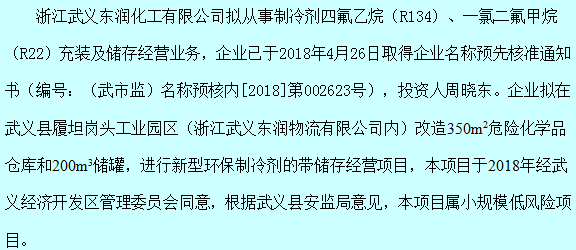浙江武义东润化工有限公司拟从事制冷剂四氟乙烷(R134)、一氯二氟甲烷(R22)充装及储存经营业务,企业已于2018年4月26日取得企业名称预先核准通知书(编号:(武市监)名称预核内[2018]第002623号),投资人周晓东。