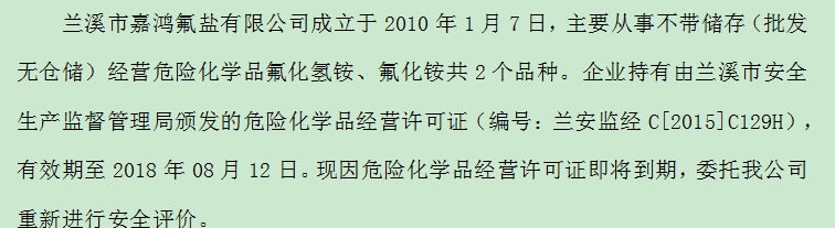 兰溪市嘉鸿氟盐有限公司成立于2010年1月7日,主要从事不带储存(批发无仓储)经营危险化学品氟化氢铵、氟化铵共2个品种
