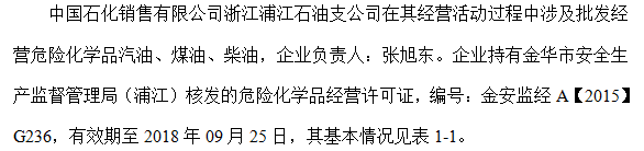 中国石化销售有限公司浙江浦江石油支公司在其经营活动过程中涉及批发经营危险化学品汽油、煤油、柴油,企业负责人:张旭东。