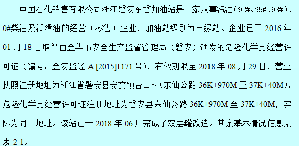 中国石化销售有限公司浙江磐安东磐加油站是一家从事汽油(92#、95#、98#)、0#柴油及润滑油的经营(零售)企业,加油站级别为三级站。