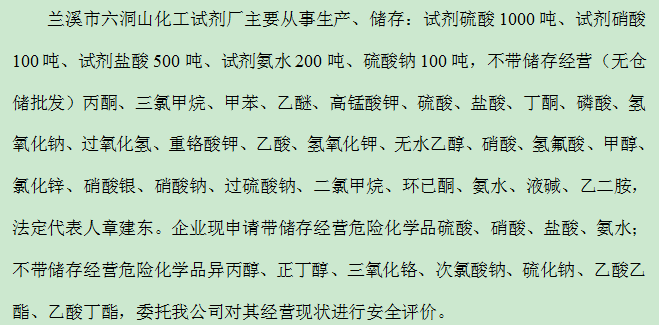 兰溪市六洞山化工试剂厂主要从事生产、储存:试剂硫酸1000吨、试剂硝酸100吨、试剂盐酸500吨、试剂氨水200吨、硫酸钠100吨,不带储存经营(无仓储批发)丙酮、三氯甲烷、甲苯、乙醚、高锰酸钾、硫酸、盐酸、丁酮、磷酸、氢氧化钠、过氧化氢、重铬酸钾、乙酸、氢氧化钾、无水乙醇、硝酸、氢氟酸、甲醇、氯化锌、硝酸银、硝酸钠、过硫酸钠、二氯甲烷、环已酮、氨水、液碱、乙二胺,法定代表人章建东。