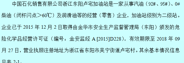 中国石化销售有限公司浙江东阳卢宅加油站是一家从事汽油(92#、95#)、0#柴油(闭杯闪点>60℃)及润滑油等的经营(零售)企业,加油站级别为二级站。