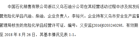 中国石化销售有限公司浙江义乌石油分公司在其经营活动过程中涉及批发经营危险化学品汽油、柴油,企业负责人:李裕兴。