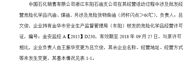 中国石化销售有限公司浙江东阳石油支公司在其经营活动过程中涉及批发经营危险化学品汽油、煤油,另涉及危险货物柴油(闭杯闪点>60℃),负责人:吕文俊,企业持有金华市安全生产监督管理局(东阳)核发的危险化学品经营许可证,编号:金安监经A【2015】D230,有效期至2018年09月27日。