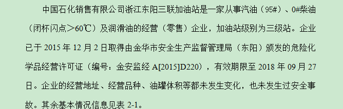 中国石化销售有限公司浙江东阳三联加油站是一家从事汽油(95#)、0#柴油(闭杯闪点>60℃)及润滑油的经营(零售)企业,加油站级别为三级站。企业已于2015年12月2日取得由金华市安全生产监督管理局(东阳)颁发的危险化学品经营许可证(编号:金安监经A[2015]D220),有效期限至2018年09月27日。企业的经营地址、经营品种、油罐体积等都未发生变化,也未发生过安全事故。