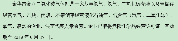 金华市金立二氧化碳气体站是一家从事氩气、氮气、二氧化碳充装以及带储存经营氢气、乙炔、丙烷,不带储存经营液化石油气、混合气(氩气、二氧化碳)、氧气、液氨的企业,法定代表人章金芳