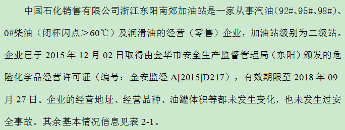 中国石化销售有限公司浙江东阳南郊加油站是一家从事汽油(92#、95#、98#)、0#柴油(闭杯闪点>60℃)及润滑油的经营(零售)企业,加油站级别为二级站。