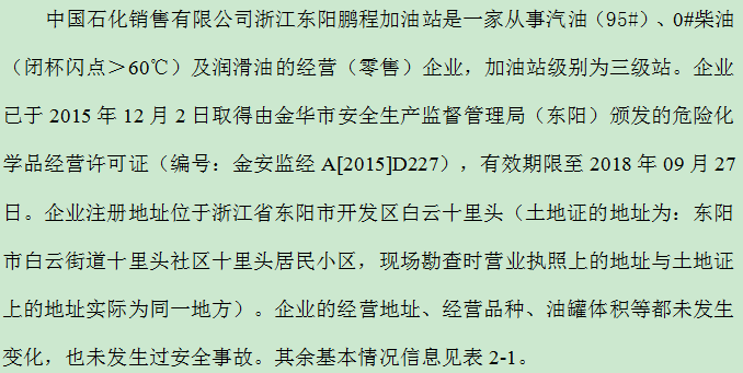 中国石化销售有限公司浙江东阳鹏程加油站是一家从事汽油(95#)、0#柴油(闭杯闪点>60℃)及润滑油的经营(零售)企业,加油站级别为三级站。企业已于2015年12月2日取得由金华市安全生产监督管理局(东阳)颁发的危险化学品经营许可证(编号:金安监经A[2015]D227),有效期限至2018年09月27日。