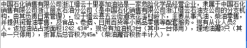 中国石化销售有限公司浙江缙云十里亭加油站是一家危险化学品经营企业,隶属于中国石化销售有限公司浙江丽水石油分公司(是中国石化销售有限公司浙江缙云石油支公司的分支机构,由其负责日常管理),位于缙云县五云街道浣花溪村岭下,主要从事汽油、柴油零售,并提供润滑油零售,及食品、卷烟、日用百货等小商品零售等配套服务。现有从业人员2人。该加油站占地面积1242.43㎡,现设有加油机3台(其中一台停用),埋地油罐3只(其中一只停用),折算后总容积为45m³(柴油罐容积折半计入)。