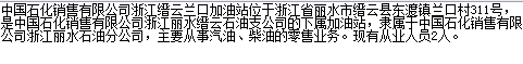 中国石化销售有限公司浙江缙云兰口加油站位于浙江省丽水市缙云县东渡镇兰口村311号,是中国石化销售有限公司浙江丽水缙云石油支公司的下属加油站,隶属于中国石化销售有限公司浙江丽水石油分公司,主要从事汽油、柴油的零售业务。现有从业人员2人。