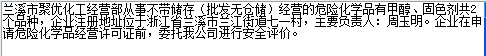 兰溪市聚优化工经营部从事不带储存(批发无仓储)经营的危险化学品有甲醇、固色剂共2个品种,企业注册地址位于浙江省兰溪市兰江街道七一村,主要负责人:周玉明。企业在申请危险化学品经营许可证前,委托我公司进行安全评价。