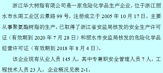 浙江华大树脂有限公司是一家危险化学品生产企业,位于浙江丽水市水阁工业区云景路99号,注册成立于2005年10月17日,主要从事聚氨酯树脂的生产,已取得了浙江省安监局核发的安全生产许可证(有效期到2020年7月28日)和丽水市安监局核发的危险化学品经营许可证(有效期到2018年8月4日)。