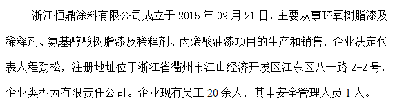 浙江恒鼎涂料有限公司成立于2015年09月21日,主要从事环氧树脂漆及稀释剂、氨基醇酸树脂漆及稀释剂、丙烯酸油漆项目的生产和销售,企业法定代表人程劲松,注册地址位于浙江省衢州市江山经济开发区江东区八一路2-2号,企业类型为有限责任公司。企业现有员工20余人,其中安全管理人员1人。