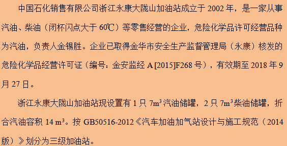 中国石化销售有限公司浙江永康大陇山加油站成立于2002年,是一家从事汽油、柴油(闭杯闪点大于60℃)等零售经营的企业,危险化学品许可经营品种为汽油,负责人金锡胜。