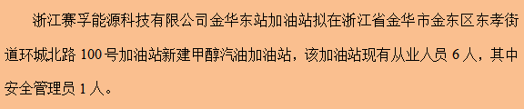 浙江赛孚能源科技有限公司金华东站加油站拟在浙江省金华市金东区东孝街道环城北路100号加油站新建甲醇汽油加油站,该加油站现有从业人员6人,其中安全管理员1人。