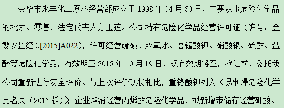 金华市永丰化工原料经营部成立于1998年04月30日,主要从事危险化学品的批发、零售,法定代表人方玉莲。公司持有危险化学品经营许可证(编号:金婺安监经C[2015]A022),许可经营硫磺、双氧水、高锰酸钾、硝酸银、硫酸、盐酸等危险化学品,有效期至2018年10月19日,现有效期将至,换证前,委托我公司重新进行安全评价