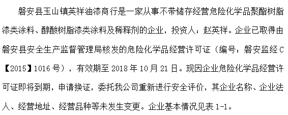 磐安县玉山镇英祥油漆商行是一家从事不带储存经营危险化学品聚酯树脂漆类涂料、醇酸树脂漆类涂料及稀释剂的企业,投资人:赵英祥
