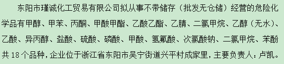 东阳市瑾诚化工贸易有限公司拟从事不带储存(批发无仓储)经营的危险化学品有甲醇、甲苯、丙酮、甲酸甲酯、乙酸乙酯、乙腈、二氯甲烷、乙醇(无水)、乙酸、异丙醇、盐酸、硫酸、磷酸、甲酸、氢氟酸、次氯酸钠、二氯甲烷、苯酚共18个品种,企业位于浙江省东阳市吴宁街道兴平村成家里,主要负责人:卢凯。