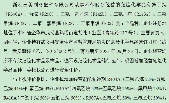 浙江三美制冷配件有限公司从事不带储存经营的危险化学品有异丁烷(R600a)、丙烷(R290)、二氟一氯乙烷(R142b)、三氟乙烷(R143a)、二氟甲烷(R32)、二氟一氯甲烷(R22)、三氟甲烷(R23)共7个品种,企业注册地址位于浙江省金华市武义县熟溪街道胡处工业区(青年路217号),主要负责人:胡法祥。