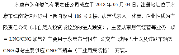 永康市弘和燃气有限责任公司成立于2018年05月04日,注册地址位于永康市江南街道西徐村上园自然村188号2楼,法定代表人王化青,企业性质为有限责任公司(非自然人投资或控股的法人独资),主要从事燃气经营等业务。项目LNG/CNG加气站主要用于永康市出租车、公交车、城际巴士以及过路车辆等; CNG母站主要供应CNG气瓶车(工业用集装格) 充装。