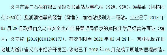 义乌市第二石油有限公司经发加油站从事汽油(92#、95#)、0#柴油(闭杯闪点>60℃)及润滑油等的经营(零售),加油站级别为二级站。