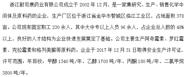 浙江耐司康药业有限公司成立于2002年12月,是一家集研究、生产、销售化学中间体及原料药的企业,生产厂区位于浙江省金华市婺城区临江工业区,占地面积378亩。公司现有固定职工230余人,其中大中专以上人员96余人,占企业总人数的48%以上,良好的人才结构为企业快速发展奠定了基础。公司主要生产阿奇霉素、罗红霉素、克拉霉素和格列美脲等原料药。企业于2017年12月31日取得安全生产许可证,许可范围:年回收:甲醇1340吨/年、乙醇1700吨/年、丙酮180吨/年、二氯甲烷3800吨/年。