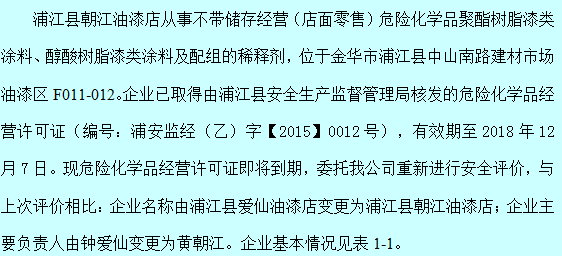 浦江县朝江油漆店从事不带储存经营(店面零售)危险化学品聚酯树脂漆类涂料、醇酸树脂漆类涂料及配组的稀释剂,位于金华市浦江县中山南路建材市场油漆区F011-012。企业已取得由浦江县安全生产监督管理局核发的危险化学品经营许可证(编号:浦安监经(乙)字【2015】0012号),有效期至2018年12月7日。