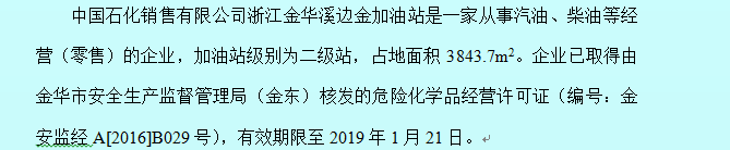 中国石化销售有限公司浙江金华溪边金加油站是一家从事汽油、柴油等经营(零售)的企业,加油站级别为二级站,占地面积3843.7m2。企业已取得由金华市安全生产监督管理局(金东)核发的危险化学品经营许可证(编号:金安监经A[2016]B029号),有效期限至2019年1月21日。