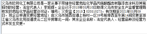 义乌市欧邦化工有限公司是一家从事不带储存经营危险化学品丙烯酸酯类树脂漆类涂料及其稀释剂的经营,法定代表人:李旭辉。企业已于2018年05月10日取得义乌市安全生产监督管理局核发的危险化学品经营许可证,编号:义安监【2018】020510275,有效期至2021年05月09日,现企业申请变更经营地址:由义乌市城西街道上杨村一区39号前排西至东第14间变更至浙江省义乌市北苑街道凌云二区平房靠北一间,其余企业名称、法定代表人、经营品种及经营方式未发生变更。